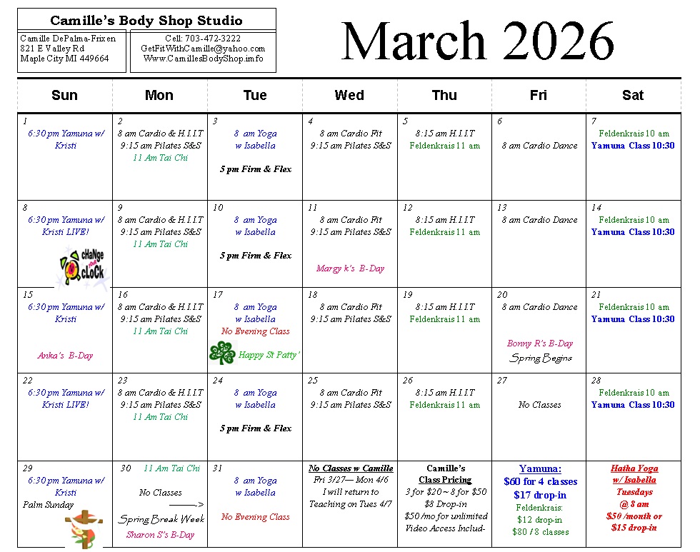 Camille's Studio & Aqua Class Pricing
